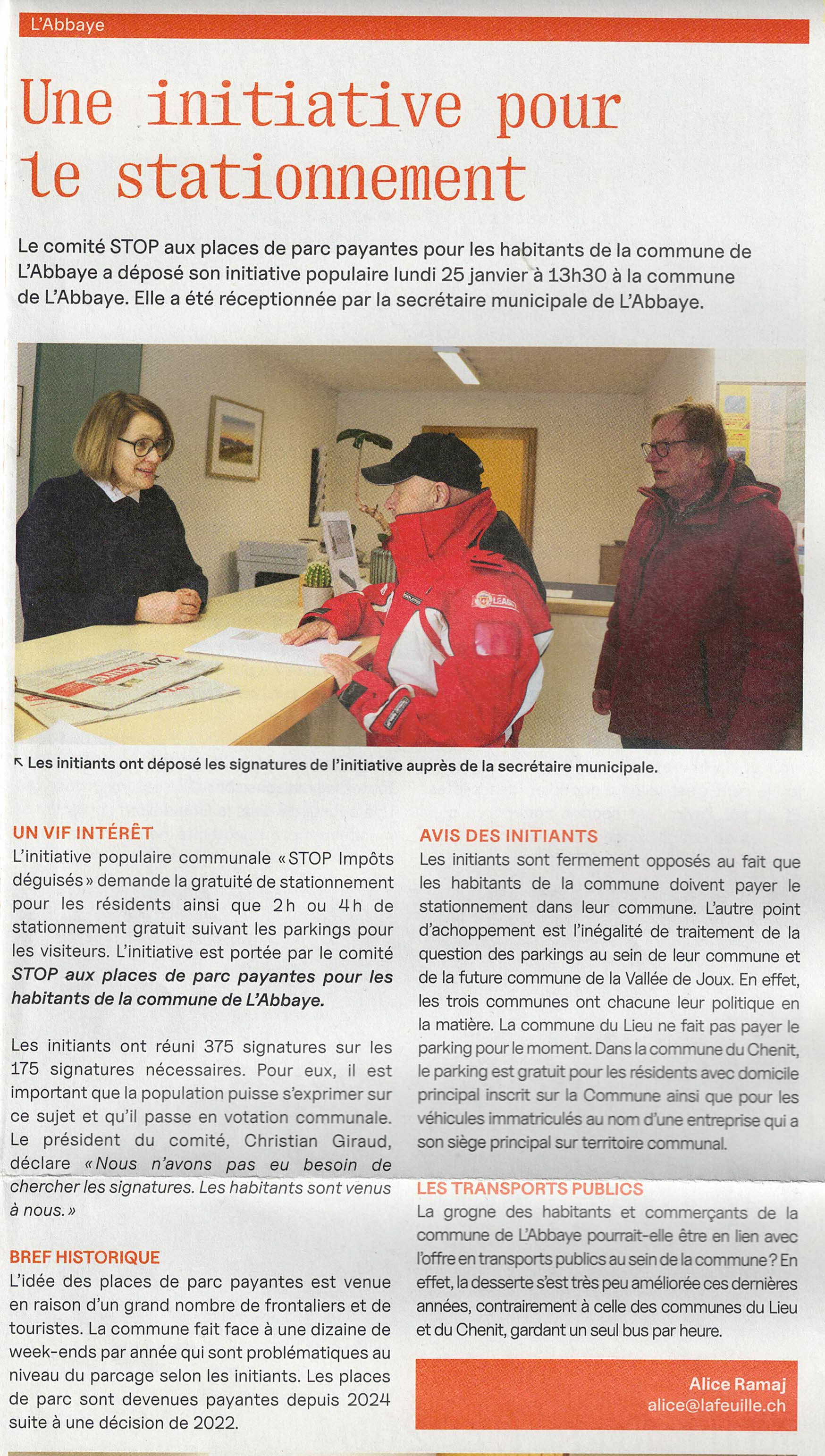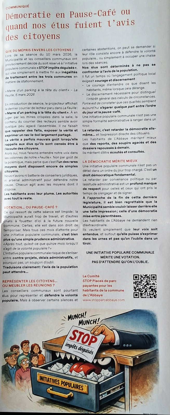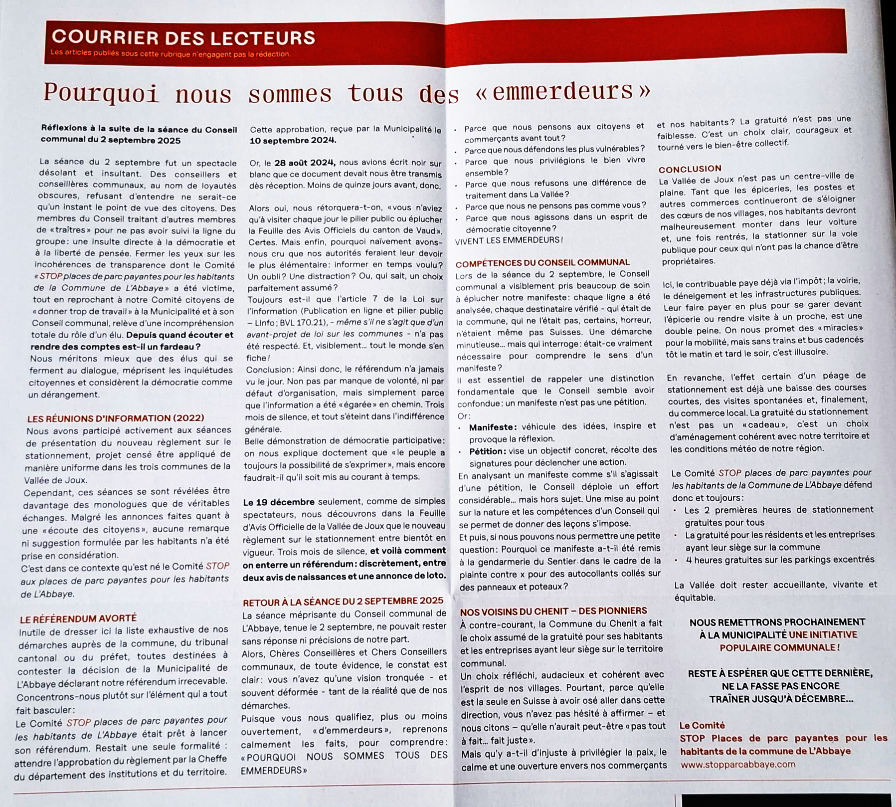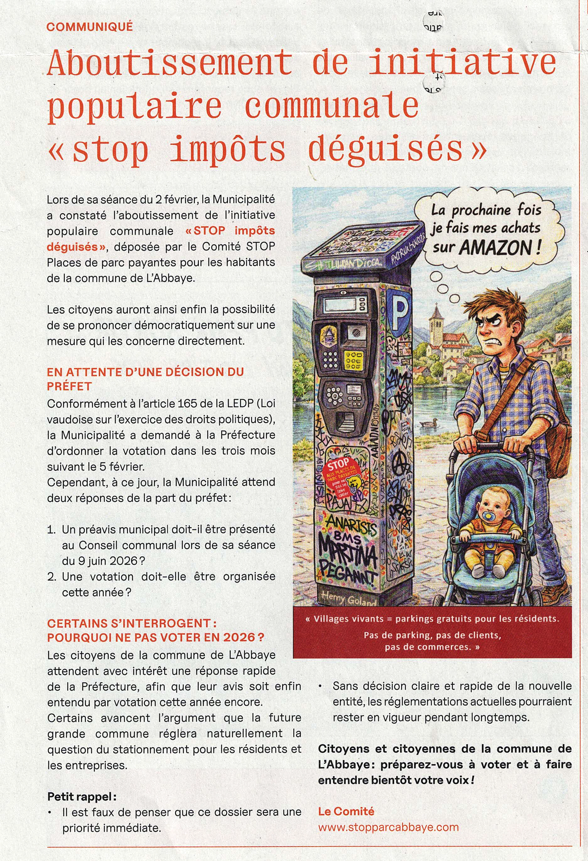 Notre demande de référendum (déposée le 23.12.2024) est refusée. Le Comité " STOP places de parc payantes pour les habitants de la commune de l'Abbaye " estime avoir été victime de rétention d'informations. Le Comité référendaire poursuit activement ses démarches dans l'intérêt des habitants des 3 villages de la commune de L'Abbaye et vous pouvez nous aider.