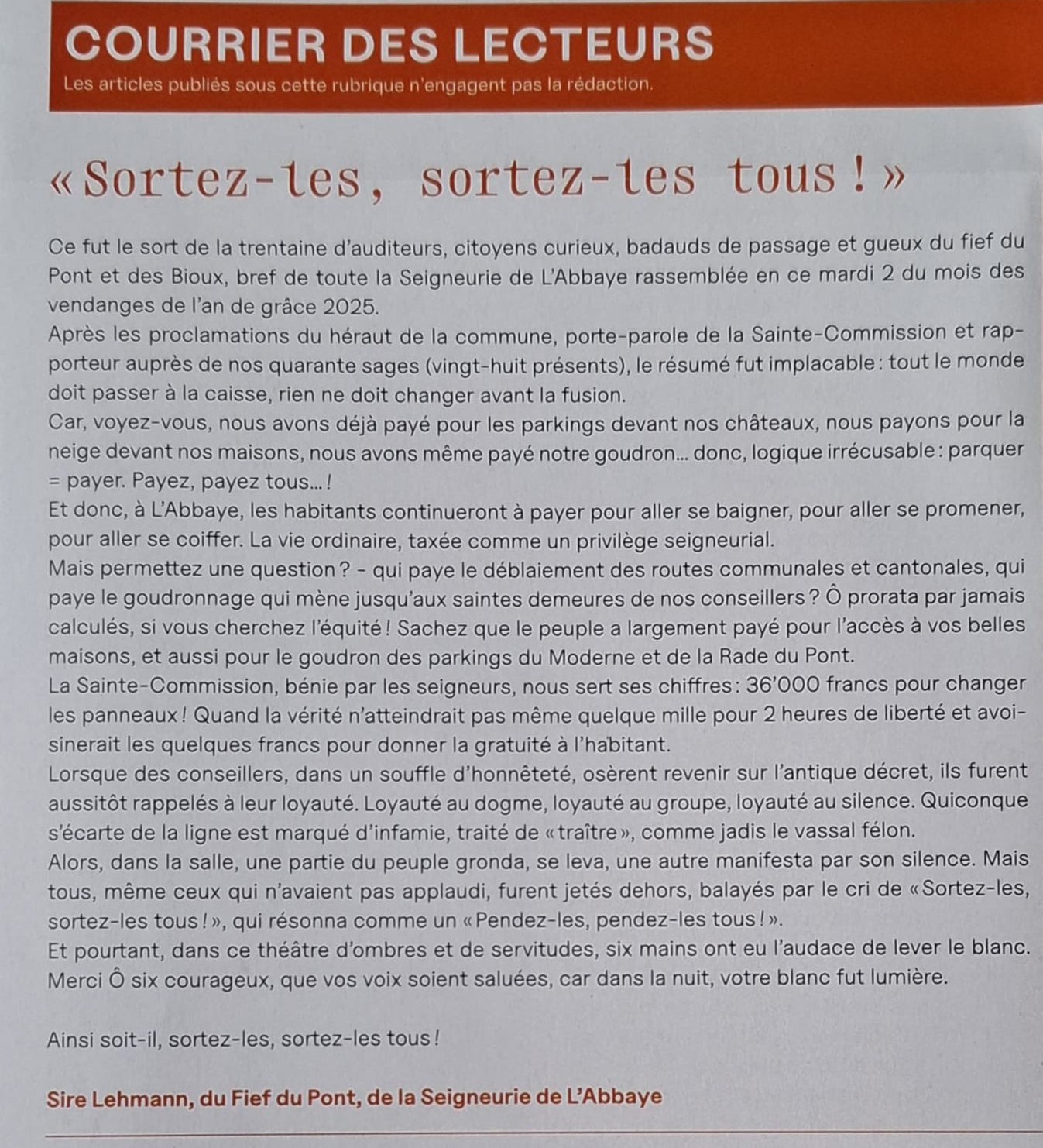 Avec le soutien de quelques membres du Conseil communal, nous avons obtenu la tenue d’une Séance extraordinaire du Conseil communal de L’Abbaye.