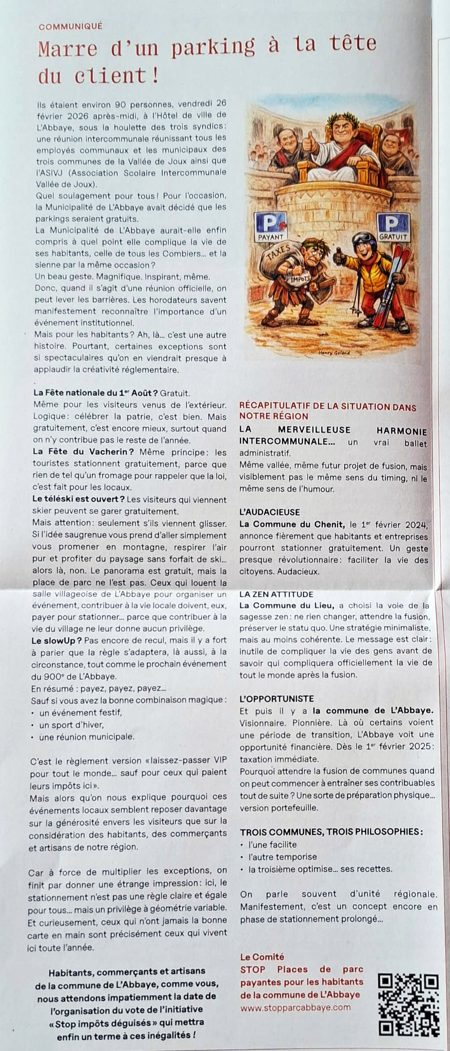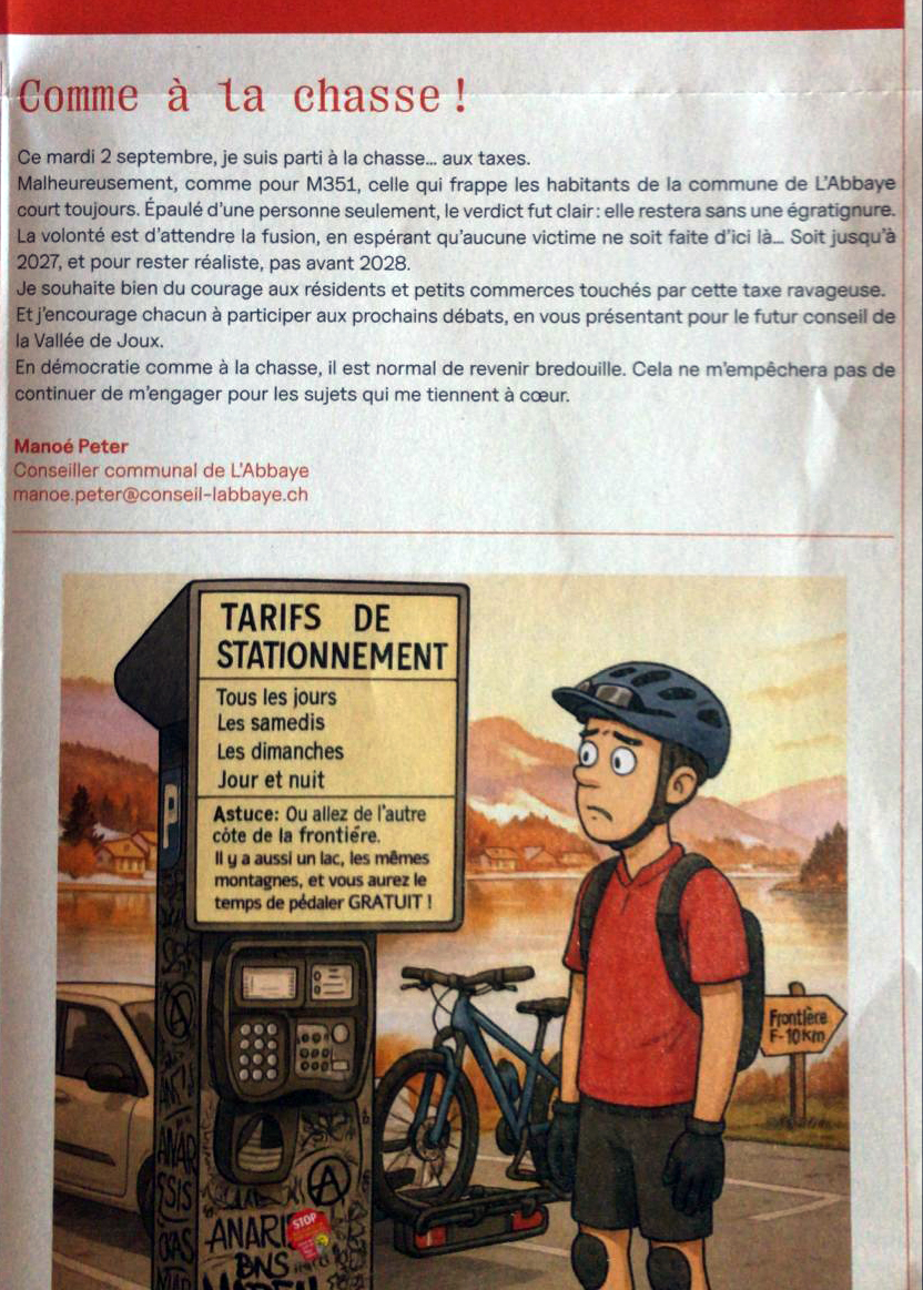 Dans le cadre d'une action citoyenne aussi pacifique qu’inoffensive, quelques autocollants « Stop places de parc payantes » ont été collés sur des poteaux et panneaux dans la commune de L’Abbaye. Mais attention : il semblerait que ces stickers représentent une menace grave pour l’ordre public. La municipalité, manifestement ébranlée par cet acte de résistance collante, a déposé une plainte contre X. Et pour bien marquer les esprits, un mandat de comparution a été délivré à notre président, qui est prié de se présenter au poste de gendarmerie du Sentier le 1er septembre.