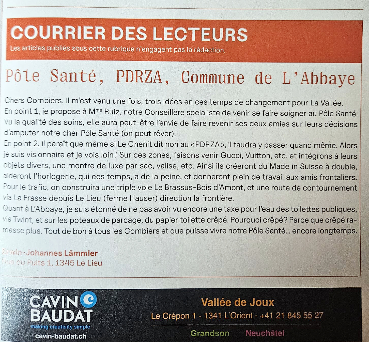 Insertion d'un article dans la Feuille d'Avis officielle de la Vallée de Joux