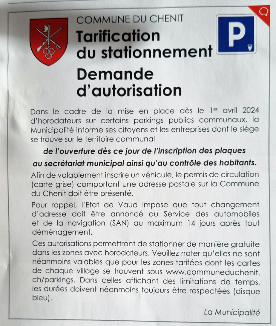 Pour rappel, la commune du Chenit, a d'ores et déjà adopté la gratuité pour ses habitants depuis le 1er avril 2024